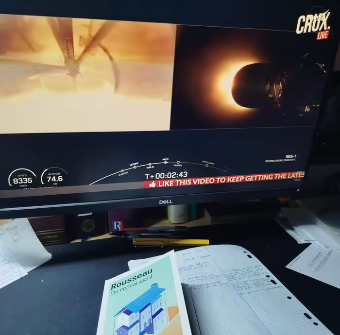 Reposer mon stylo. Fermer mon livre. Allumer l’ordinateur. Interrompre ma lecture de Rousseau, le temps d’assister au lancement de la fusée Falcon 9, en direct sur YouTube.